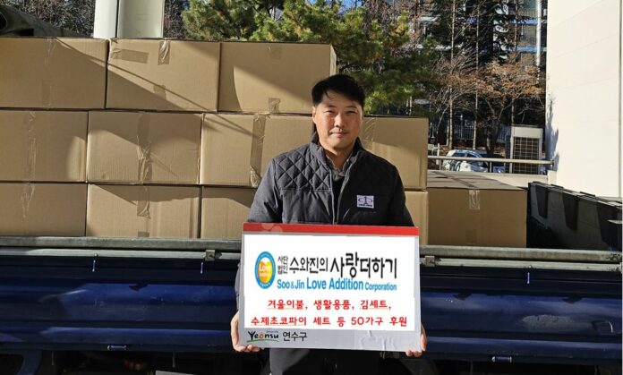 또 ‘수와진의 사랑더하기’에서는 연수구의 어려운 이웃을 위해 전달해 달라며, 이불과 생활용품 등 선물꾸러미 50박스를 기부했다.