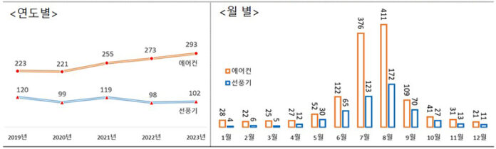 냉방기 화재가 해마다 증가 추세인 가운데, 최근 5년(2019~2023)간 발생한 냉방기 화재는 총 1803건으로 이 중 에어컨 관련 화재는 1265건이며 선풍기는 538건인 것으로 나타났다.