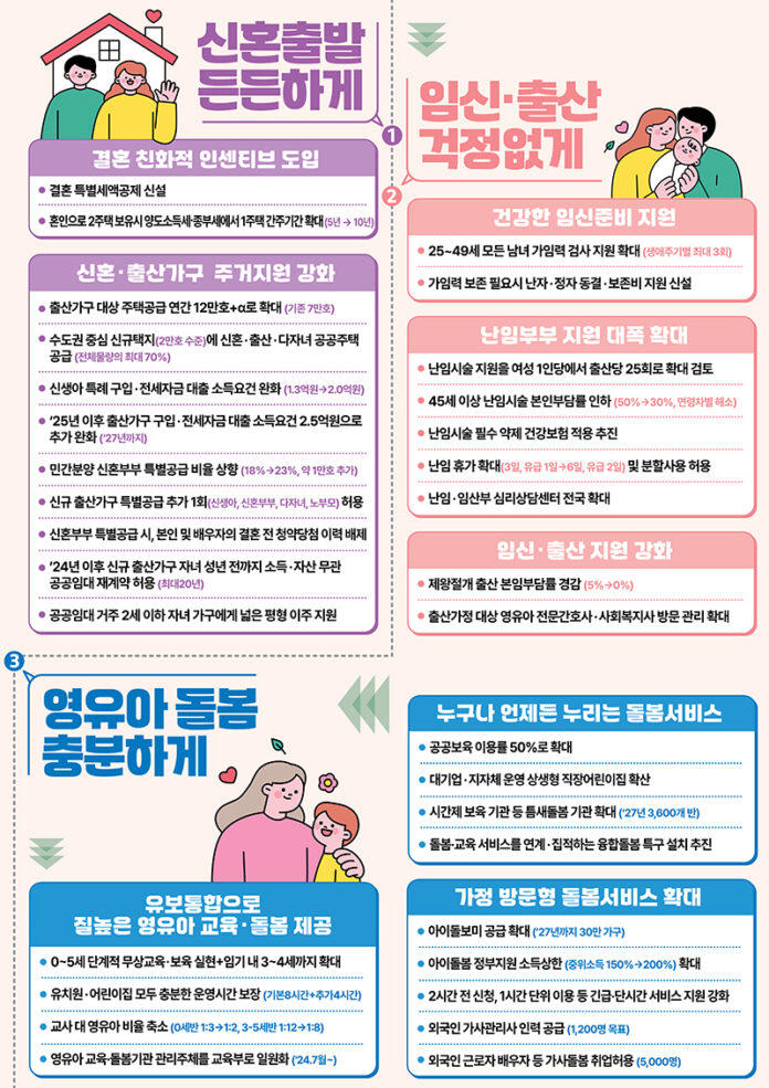 ‘저출생 추세 반전 대책’ 발표…일·가정 양립, 양육, 주거 등에 지원 집중