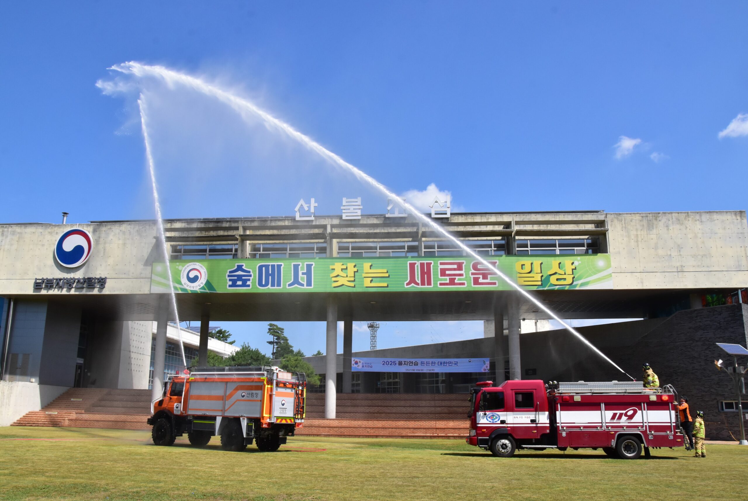 이번 훈련은 남부지방산림청 청사에 화재발생 상황을 가정하여 화재발생, 신고, 전파, 직원대피, 중요문서 반출에 이은 소화전 및 고성능산불진화차량의 초기 진압과 안동 119소방대와 합동 화재진압 상황으로 진행되었다.