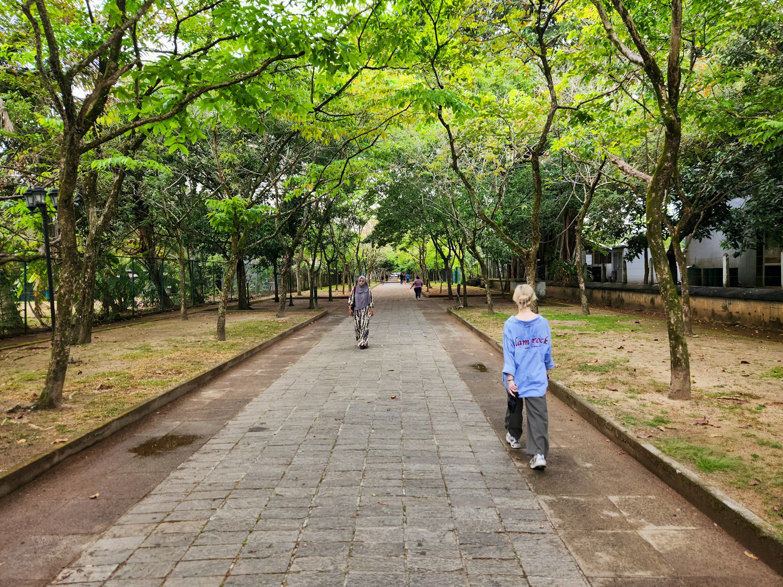 Two people walking down a path in a park